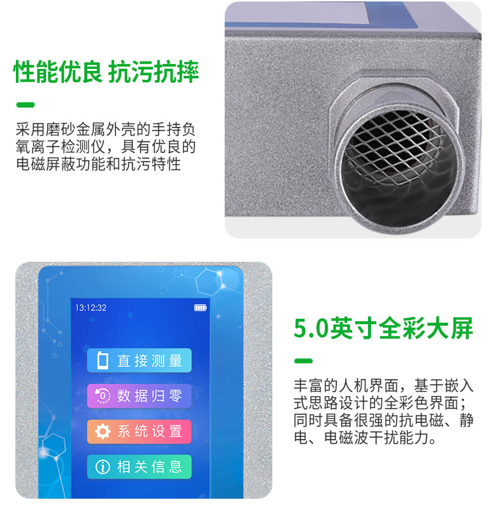 負氧離子檢測儀具有測量穩定、反應迅速、數據準確等優點,同時具備強大的抗電磁、靜電、電磁波干擾能力,對小粒徑負離子具有優異的敏感性和捕捉能力。