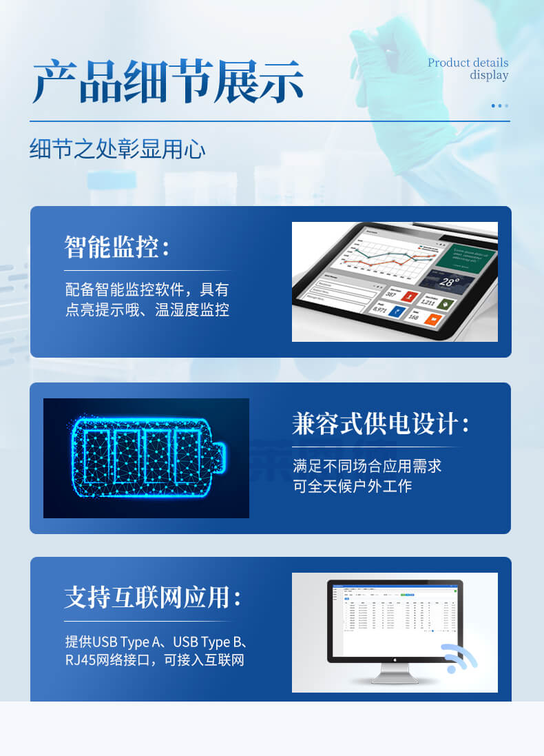 智能監(jiān)控:配備智能監(jiān)控軟件,具有點(diǎn)亮提示哦、溫濕度監(jiān)控。